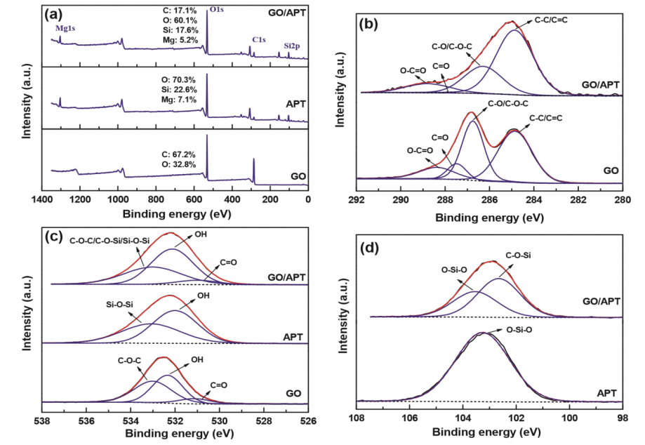 Fig 4. (A)GO,APT,GO/APT(1/4)復(fù)合材料的XPS測(cè)量,以及相應(yīng)的(B)C 1s,(C)O 1s和(D)Si 2p譜。圖中顯示了原始數(shù)據(jù)(黑線)、背景(黑虛線)、擬合線(紅線)和去卷積峰(藍(lán)線)。
