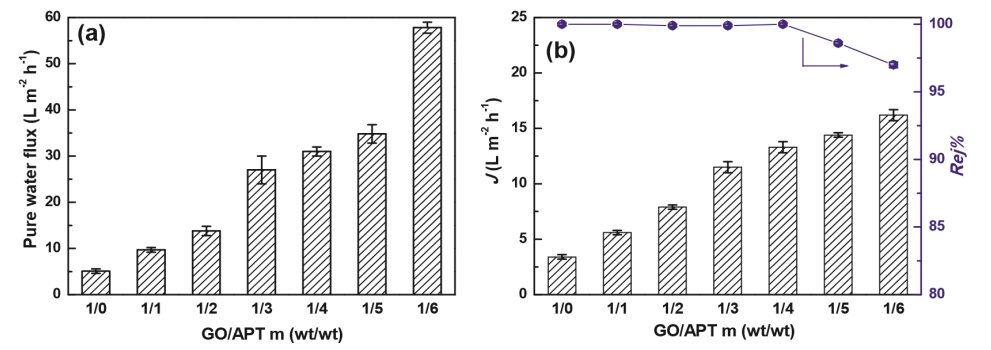−1)中,GO/APT比對(duì)(A)純水通量和(B)分離性能的影響。