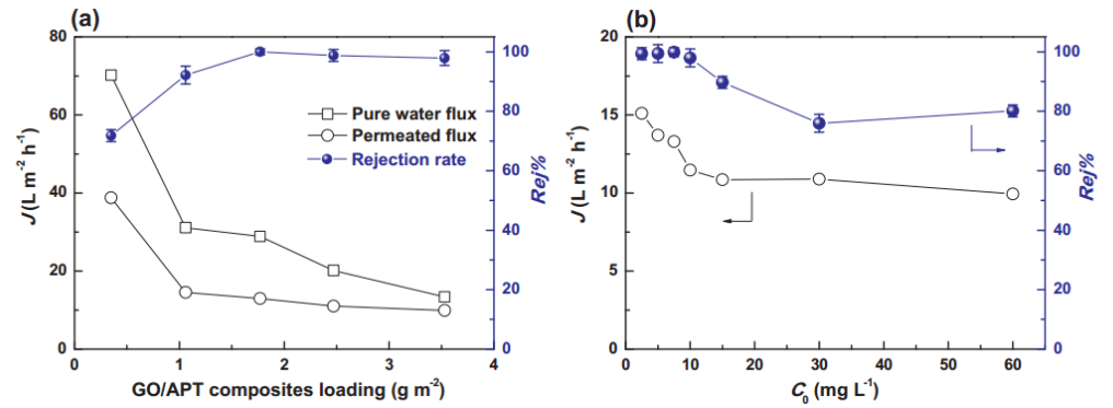 Fig 10. (A)GO/APT復(fù)合材料負(fù)載量和(B)Rh B進(jìn)料濃度對(duì)GO/APT(1/4)膜分離性能的影響。