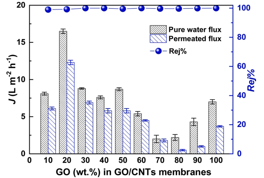 Fig 2. GO 含量對純水通量和 GO/CNTs 復(fù)合膜對 7.5 mg·L