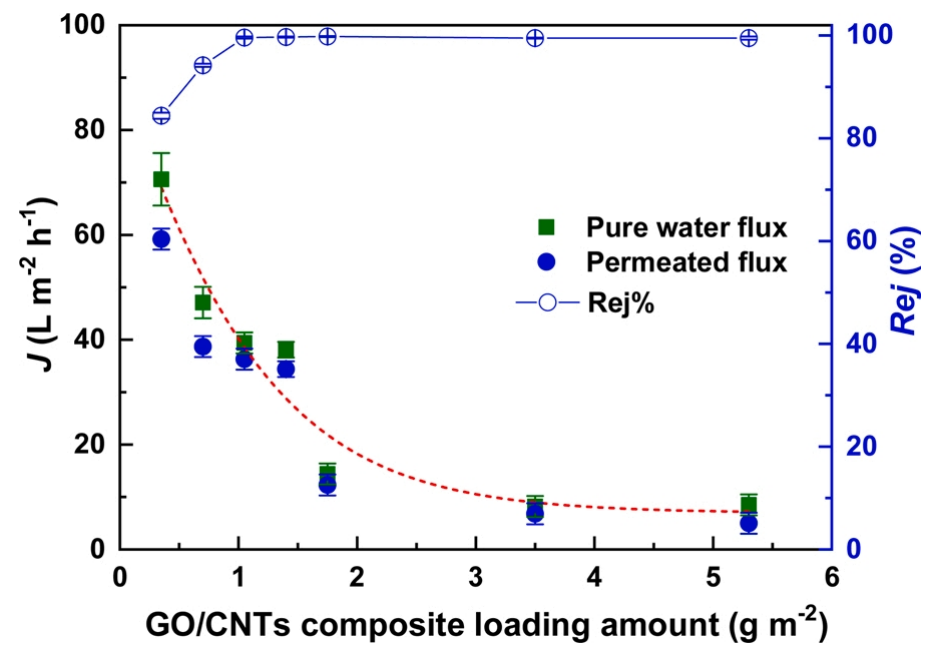 通過將一維羧基化多壁碳納米管(MWCNTs-COOH)插入二維氧化石墨烯(GO)納米片中,可以輕松制備出具有精細(xì)分級納米結(jié)構(gòu)的GO/CNTs復(fù)合膜,用于高效的有機廢水處理。通過XRD、Raman、FTIR、TEM和水接觸角的表征結(jié)果,MWCNTs-COOH通過接枝反應(yīng)成功插入到GO層狀中間層中,從而提高了水的滲透通量和膜的穩(wěn)定性。針對亞甲基藍(lán)染料溶液,系統(tǒng)研究了GO/CNTs比例、負(fù)載量、CNTs類型和載體類型對膜分離性能的影響。在優(yōu)化條件下制備的GO/CNTs復(fù)合膜在0.9 bar的跨膜壓差下,對亞甲基藍(lán)溶液的滲透通量分別為34.4 L m