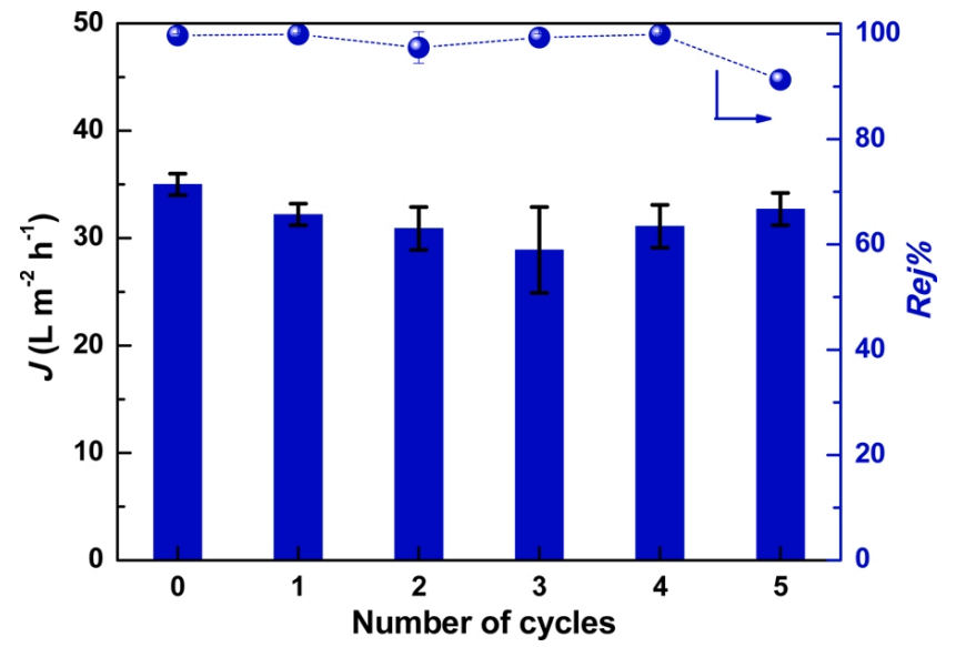 -1和99.7%以上的截留率。與原始GO膜相比,它的水滲透通量提高了近10倍,同時保持了高截留率。此外,靜電相互作用和尺寸排阻效應(yīng)協(xié)同作用,導(dǎo)致GO/CNTs膜對不同帶正/負(fù)電荷的染料和中性有機分子的有效分離性能。這種GO/CNTs膜還表現(xiàn)出良好的耐酸性化學(xué)穩(wěn)定性和高效的分離性能。