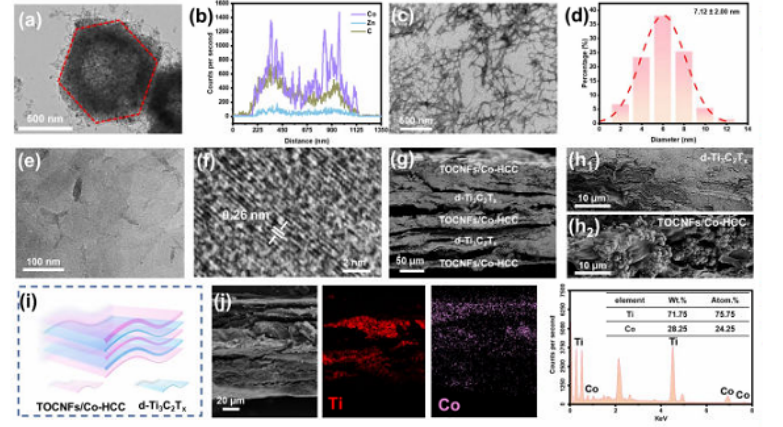圖2 HMN復(fù)合薄膜的微觀結(jié)構(gòu)。分別為 Co-HCC 的 a TEM 圖像和 b EDS 線掃描圖像。分別為 TOCNF 的 c TEM 圖像和 d 尺寸分布。分別為 d-Ti3C2TX 納米片的 e TEM 圖像和 f 晶格條紋。 g、h SEM 圖像、i 示意圖和 j HMN 復(fù)合薄膜的 EDS 映射。