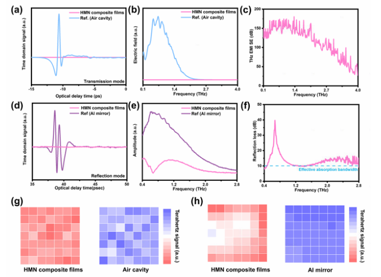 圖5. HMN復(fù)合薄膜的太赫茲電磁屏蔽性能。傳輸模型和反射模型中空氣、Al 鏡和 HMN 復(fù)合薄膜的 a、d 太赫茲時域脈沖。 b、e 傳輸模型和反射模型中空氣、鋁板和 HMN 復(fù)合薄膜的電場強度。 c、f HMN復(fù)合薄膜在傳輸模型和反射模型中的EMI SE和反射損耗。 g、h透射模式和反射模式的太赫茲成像熱譜圖。