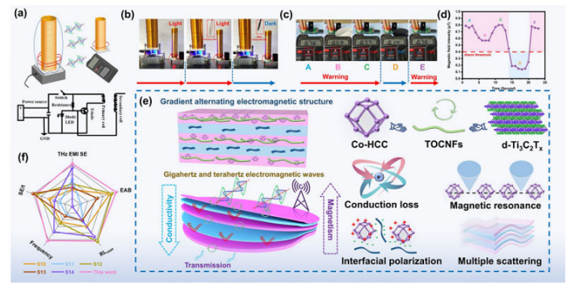 隨著通信技術(shù)的不斷進步,對具有多功能、寬帶EMI性能的電磁屏蔽干擾(EMI)材料的需求日益迫切。控制電氣和磁性元件以及設(shè)計 EMI 材料結(jié)構(gòu)引起了廣泛的興趣,但仍然是一個巨大的挑戰(zhàn)。在此,我們報道了通過交替真空輔助過濾過程由中空金屬有機框架/層狀MXene/納米纖維素(HMN)組成的交替電磁結(jié)構(gòu)復(fù)合薄膜。 HMN復(fù)合薄膜在GHz頻率(Kaband時為66.8 dB)和THz頻率(0.1-4.0 THz時為114.6 dB)表現(xiàn)出優(yōu)異的EMI屏蔽性能。此外,HMN復(fù)合薄膜在0.7 THz處還表現(xiàn)出39.7 dB的高反射損耗,有效吸收帶寬高達2.1 THz。此外,HMN復(fù)合薄膜表現(xiàn)出卓越的光熱轉(zhuǎn)換性能,在2.0 Sun下可達到104.6 °C,在0.8 W cm−2下可達到235.4 °C。獨特的微觀和宏觀結(jié)構(gòu)設(shè)計結(jié)構(gòu)將通過界面偏振/多重散射吸收更多的入射電磁波,并通過局部表面等離子體共振效應(yīng)產(chǎn)生更多的熱能。這些特性使 HMN 復(fù)合薄膜成為未來 6G 通信和寒冷環(huán)境中電子設(shè)備保護的先進 EMI 器件的有前途的候選者。