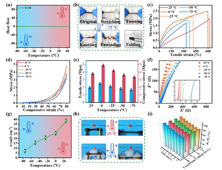 圖 3. (a) 中藥水凝膠的 DSC 圖譜。 (b) 照片顯示水凝膠在 -75°C 下承受不同的變形。 (c - e) 水凝膠在不同溫度-75 至 25°C 下的機(jī)械性能。 (f) 奈奎斯特圖(插圖:放大的高頻區(qū)域)和 (g) 不同溫度下中藥水凝膠的電導(dǎo)率。 (h) 水凝膠在 25°C 和 -75°C 下充當(dāng)導(dǎo)體的演示。 (i) 將水凝膠在 25°C 和 50% RH 下放置一周后的重量比。