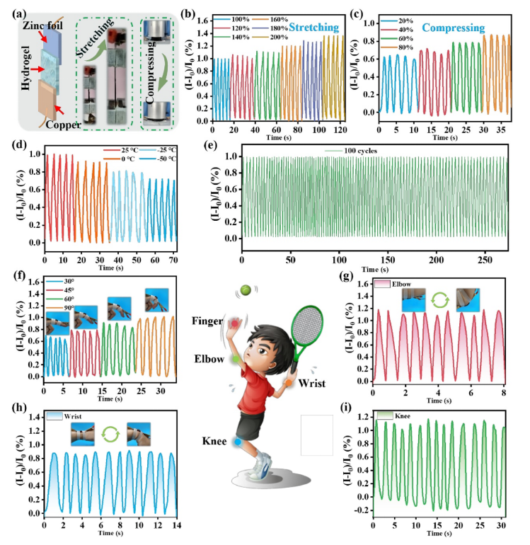 圖5.(a)基于TCM水凝膠的柔性電池/自供電傳感器示意圖。自供電傳感器的實(shí)時(shí)電流變化:(b)不同拉伸應(yīng)變(100% - 200%)下; (c) 不同壓縮應(yīng)變(20% - 80%)下和(d)不同溫度下(應(yīng)變:100%)。 (e) 自供電傳感器在 100% 應(yīng)變下連續(xù) 100 個(gè)周期的電流變化。 (f、g、h 和 i) 用于監(jiān)測(cè)人體運(yùn)動(dòng)的自供電傳感器。