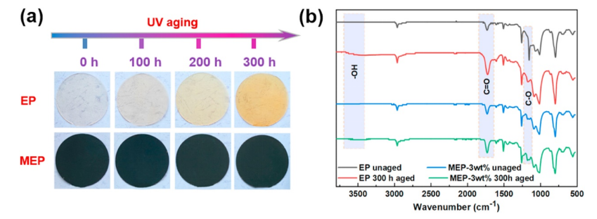 采用原位生長(zhǎng)方法合成了氟化氧化石墨烯@CeO2(FGO@CeO2),并將其作為填料摻入環(huán)氧樹脂中以提高其抗紫外線老化性能。在紫外線照射下,它促進(jìn)了改性環(huán)氧樹脂(MEP)的表面富集,形成了紫外線阻擋層。引入FGO@CeO2在MEP內(nèi)誘導(dǎo)n→π*電子躍遷并降低電子激發(fā)閾值,擴(kuò)大紫外光譜吸收帶并增強(qiáng)紫外吸收強(qiáng)度。與原始環(huán)氧樹脂相比,MEP 的紫外線吸收能力提高了 785%。經(jīng)過(guò)300小時(shí)的紫外線照射后,MEP中的光熱溫升比純環(huán)氧樹脂高13.67±2℃。