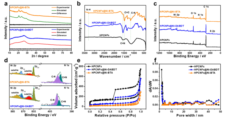 Fig 2. HPCNFs、HPCNFs@Ni-DABDT 和 HPCNFs@Ni-BTA 的結構特征。(a) HPCNFs@Ni-DABDT 和 HPCNFs@Ni-BTA 的實驗和模擬 XRD 圖。(b) HPCNFs、HPCNFs@Ni-DABDT 和 HPCNFs@Ni-BTA 的傅立葉變換紅外光譜。(c) HPCNFs、HPCNFs@Ni-DABDT 和 HPCNFs@Ni-BTA 的 XPS 勘測光譜和 (d) Ni 2p 和 N 1s XPS 光譜。(e)HPCNFs、HPCNFs@Ni-DABDT 和 HPCNFs@Ni-BTA 的氮吸附-解吸等溫線和(f)相應的孔徑分布。