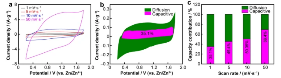 -1時的擴(kuò)散控制和電容電荷貢獻(xiàn);c PVP-PANC-0.8//Zn ZHS 在掃描速率為1至50 mV s