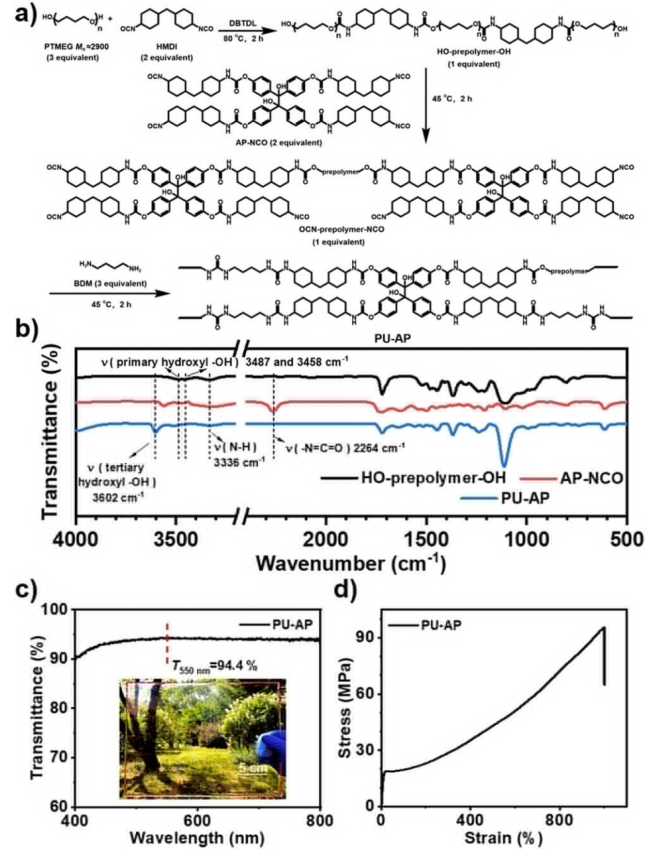-1 范圍內的傅立葉變換紅外光譜。 c) 厚度為 0.25 mm 的 PU-AP 片材的紫外/可見透射光譜。d) PU-AP 熱固性材料的應力-應變曲線。