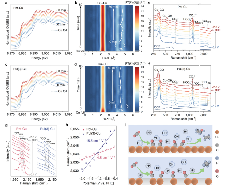 -2。原位 X 射線吸收光譜和拉曼光譜研究進一步證實了不同 CN 的 Cu 催化劑對 *CO 的吸附不同,從而引導(dǎo)了 CO
