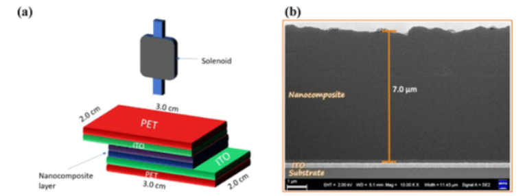 圖2. (a) 雙疊層壓電納米發(fā)電機(jī)結(jié)構(gòu)示意圖。(b) FIB-SEM橫截面結(jié)構(gòu)的圖像。