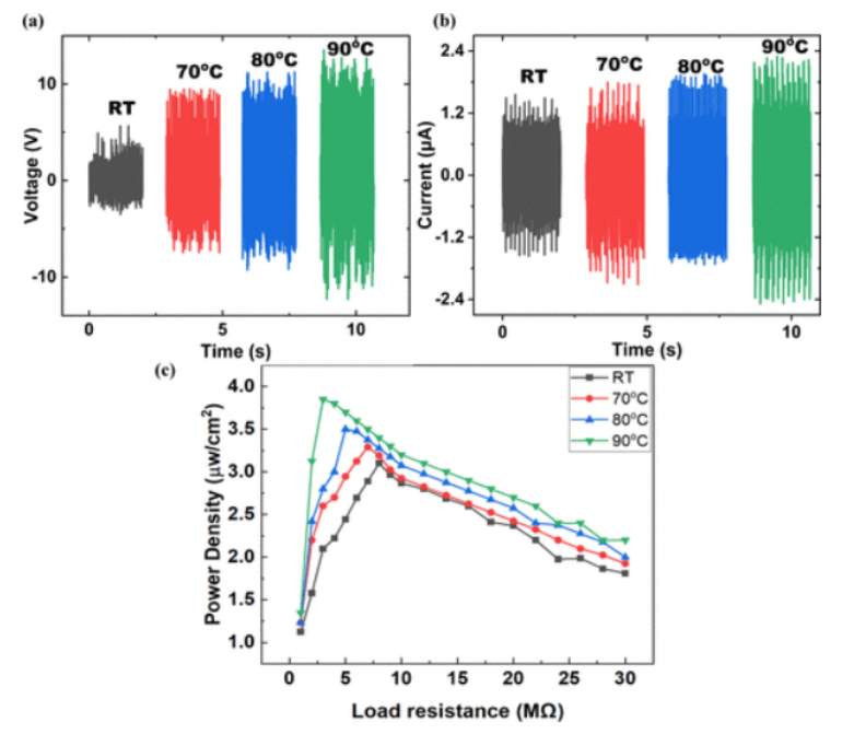 x的適宜配比,實(shí)現(xiàn)了可重復(fù)穩(wěn)定的全溶液制備。在室溫下,納米發(fā)電機(jī)的最佳輸出電壓為9.0 V,電流為1.5μA。因此,當(dāng)溫度升高到90°C時(shí),它增加到24.0 V和1.75μA,獲得3.85μW/cm