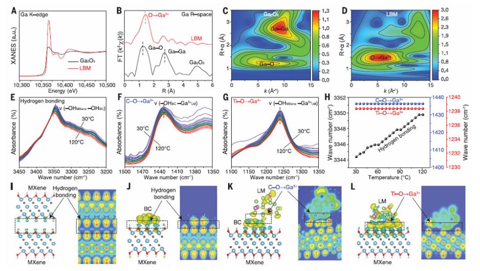 圖 2. LBM 薄膜的界面相互作用表征。 (A) Ga2O3 和 LBM 薄膜的 Ga K 邊 XANES 光譜。 (B) R 空間中 Ga2O3 和 LBM 薄膜的傅里葉變換 (FT)。 (C 和 D) Ga2O3 (C) 和 LBM 薄膜 (D) 的 WT 分析。 (E 至 G) 在 30° 至 120°C 的加熱溫度范圍內(nèi)進(jìn)行 VT-FTIR 光譜分析。 (E) MXene 納米片和 BC 之間的氫鍵。 (F) BC 和 LM 之間的 C-O→Ga3+ 配位鍵。 (G) MXene 納米片和 LM 之間的 Ti-O→Ga3+ 配位鍵。 (H) 與氫鍵和配位鍵相關(guān)的波數(shù)偏移比較。 (I 到 L) 隨著 Q 增加的四種界面相互作用的 DFT 計(jì)算。(I) MXene-MXene(弱氫鍵),(J) MXene-BC(氫鍵),(K) BC-LM(弱配位鍵),和 (L) MXene-LM(強(qiáng)配位鍵)。