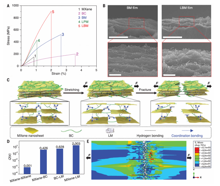 圖 3. LBM 薄膜的力學(xué)性能和斷裂機(jī)制。(A)MXene、BC、BM、LPM 和 LBM 薄膜的應(yīng)力-應(yīng)變曲線。(B)BM 和 LBM 薄膜的斷裂形貌。比例尺,低分辨率圖像中為 5 毫米,高分辨率圖像中為 1 毫米。(C)LBM 薄膜的擬議斷裂機(jī)制。(D)兩種界面處 Q 的 DFT 計(jì)算,四種相互作用強(qiáng)度:MXene-MXene、MXene-BC、BC-LM 和 MXene-LM。(E)LBM 薄膜斷裂機(jī)制的有限元分析。