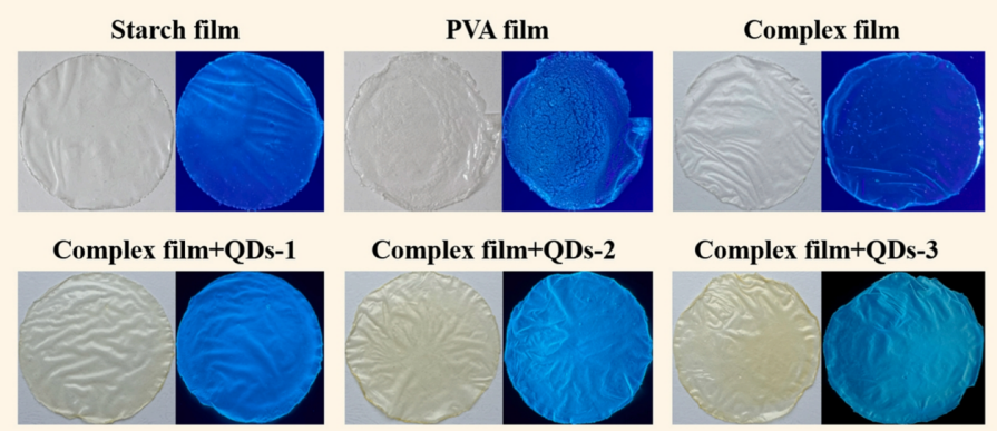 文章報道了一種簡單、綠色的制備石墨烯量子點(GQDs)的方法,即利用玉米淀粉作為納米填料制備淀粉基活性薄膜。GQDs水溶液具有不受激發(fā)波長影響的發(fā)光特性、穩(wěn)定的光致發(fā)光特性和良好的生物安全性。結果表明,淀粉基GQDs與天然高分子淀粉/聚乙烯醇(PVA)基質(zhì)具有良好的相容性。當GQDs的添加量大于50 μg/mL時,復合薄膜具有良好的UV阻隔性能。此外,100 μg/mL的GQDs顯著提高了薄膜的斷裂伸長率和拉伸強度,分別提升了1.79倍和2.94倍,而水溶性僅為淀粉/ PVA薄膜的53.9%。含有150 μg/mL GQDs的淀粉/PVA薄膜對2,2-二苯基-1-苦酰肼自由基的最大清除率為83.3%。隨著GQDs添加量的增加,復合薄膜對金黃色葡萄球菌和大腸桿菌的抑制作用越來越顯著。淀粉源復合薄膜的環(huán)保性和優(yōu)越的性能使其有望成為傳統(tǒng)塑料材料的活性包裝的替代品。