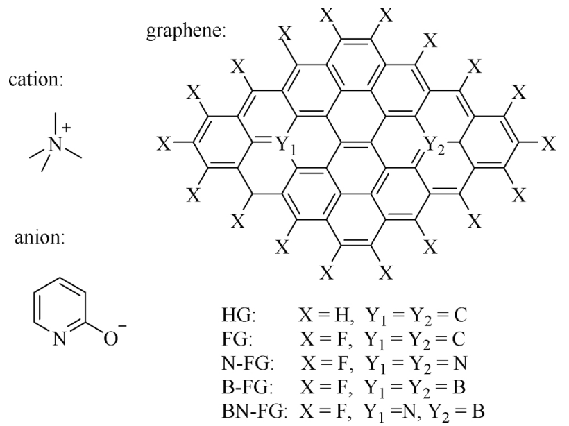 圖1. [TMA][HPy]和石墨烯的陽/陰離子結構。
