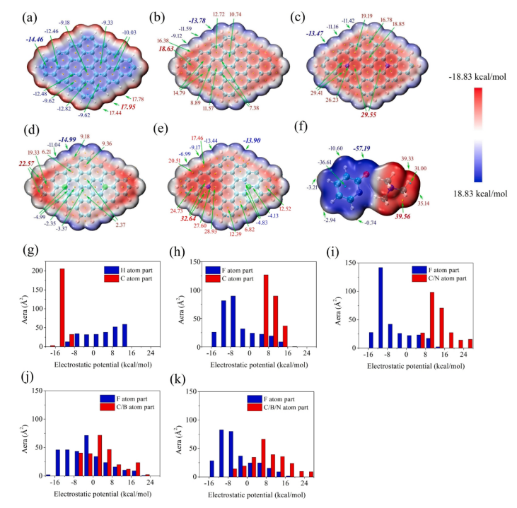 圖2. (a) HG、(b) FG、(c) N-FG、(d) b -FG、(e) BN-FG、(f) [TMA][HPy]分子表面的靜電電位計算,以及(g) HG、(h) FG、(i) N-FG、(j) B-FG、(k) BN-FG各ESP范圍內(nèi)的表面積。