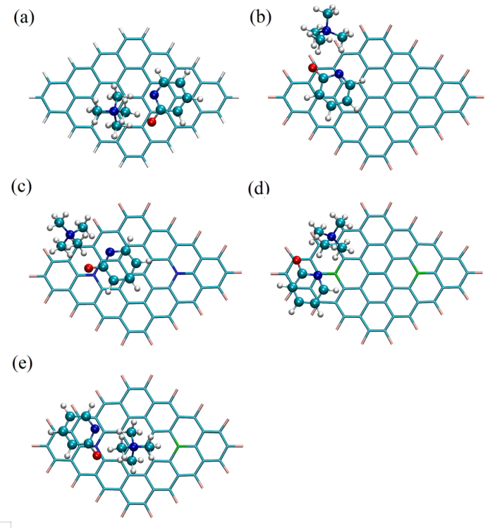 圖6. 不同[TMA][HPy]/石墨烯配合物的IGMH表面圖,(a) [TMA][HPy]/HG, (b) [TMA][HPy]/FG, (c) [TMA][HPy]/N-FG, (d) [TMA][HPy]/ B-FG, (e) [TMA][HPy]/BN-FG,并根據(jù)δG