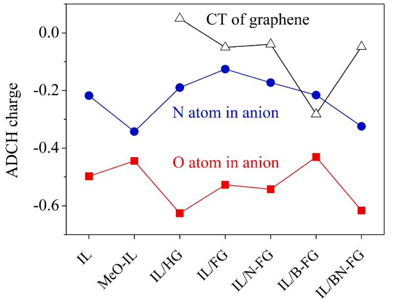 圖4. [TMA][HPy]/石墨烯體系中的電荷轉(zhuǎn)移和[TMA][HPy] (IL)和[TMA][3-MeO-HPy] (MeOIL)陰離子中N和O原子的ADCH電荷。MeO-IL中的O原子代表羥基O原子。