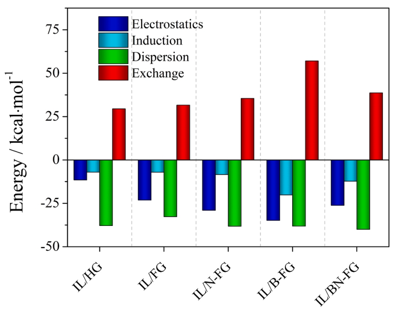 圖5. 石墨烯表面IL的SAPT能量分解分析。圖中IL為[TMA][HPy]。