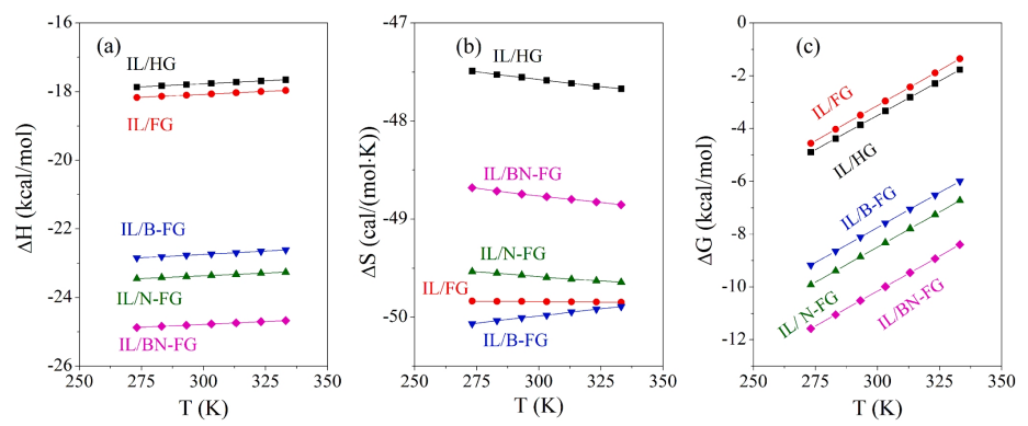 圖7. [TMA][HPy]在不同溫度下吸附在不同石墨烯表面的焓變(a)、熵變(b)和自由能變化(c)。圖中IL為[TMA][HPy]。