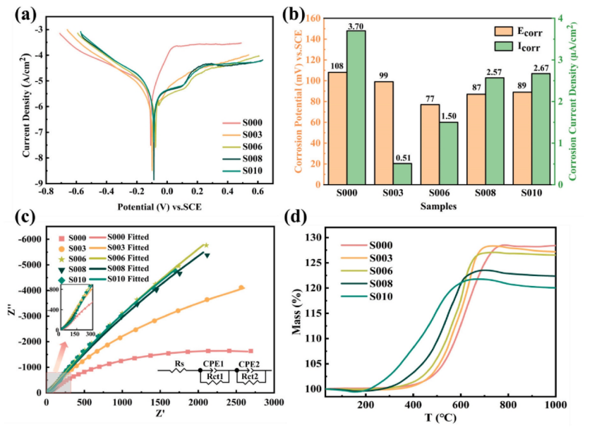 Fig 5. (a) 電位極化曲線;(b) 塔菲爾外推法得出的統(tǒng)計(jì)結(jié)果;(c) 奈奎斯特圖(插圖為等效電路);(d) S000、S003、S006、S008 和 S010 的 TG 曲線。