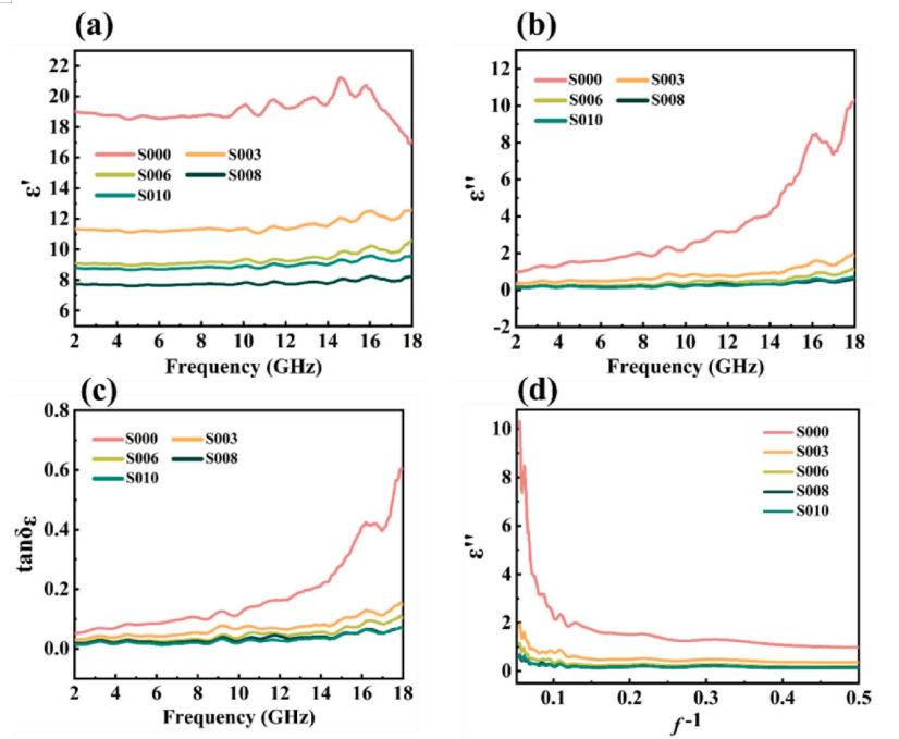 Fig 6. (a) 復(fù)介電常數(shù)的實(shí)部、虛部和 (c) 介電損耗正切(tanδε = ε?/ε?)。(d) S000、S003、S006、S008 和 S010 的 ε?-f - 1 圖。
