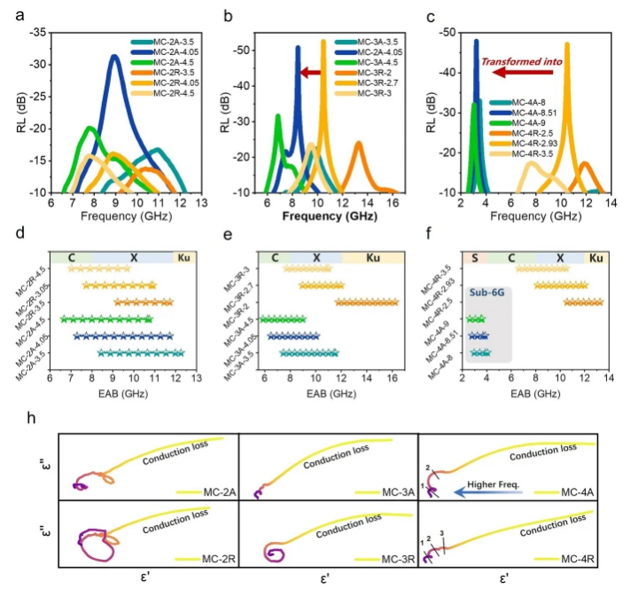 二維碳基材料在中高頻范圍內(nèi)表現(xiàn)出良好的電磁波吸收能力,但由于對(duì)極化響應(yīng)機(jī)制的控制有限和共振行為不明確,在低頻吸收方面面臨挑戰(zhàn)。在本研究中,作者提出了一種新方法,通過(guò)通過(guò)操縱改變MC的偶極子極化和共振響應(yīng)特性來(lái)提高三維空腔的低頻吸收效率。研究發(fā)現(xiàn)這種受控極化機(jī)制能夠?qū)е码姶挪ㄎ諈^(qū)間顯著地從高頻X波段向低頻S波段移動(dòng),并在S波段達(dá)到-47.9 dB的反射損耗(RL)。該研究揭示了定向電磁耦合在影響電磁響應(yīng)和吸收方面的重要作用,提出了一種強(qiáng)化低頻吸收的通用策略,可在無(wú)磁性組分參與的情況下實(shí)現(xiàn)調(diào)諧低頻吸收,這為低維材料在信道密集的低頻波段和磁受限領(lǐng)域開(kāi)拓了應(yīng)用空間。