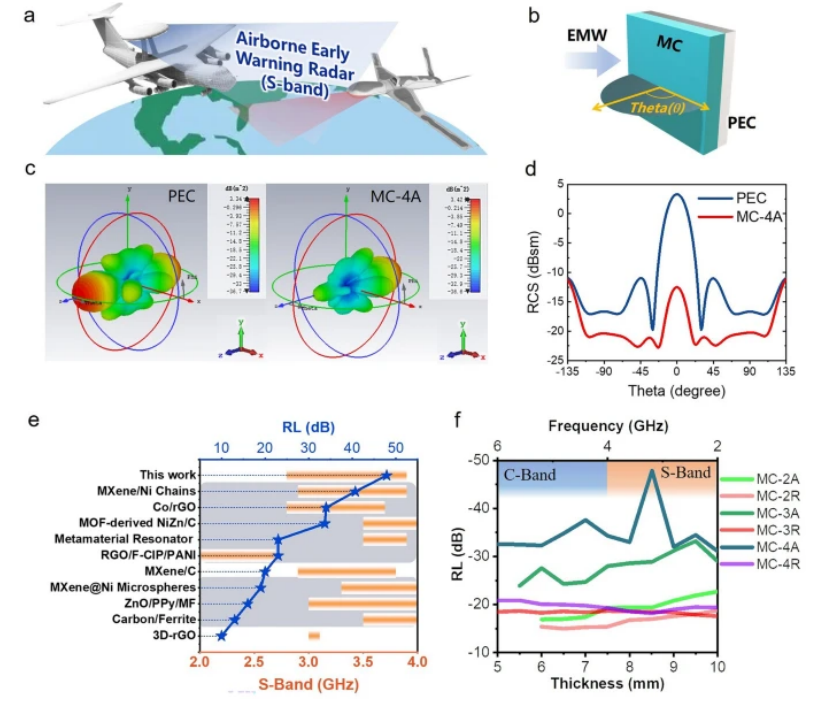 Fig 8. a S波段機(jī)載預(yù)警雷達(dá)工作原理圖。b吸收材料的模型設(shè)置為邊長(zhǎng)為100 mm的方形平板,底部為邊長(zhǎng)相同的PEC制成的反射板。c模擬結(jié)果。d PEC和MC-4A在不同方位的RCS。e與以往低頻吸收材料的對(duì)比,其中灰色基底表示包含磁性材料。f MC的低頻吸收特性。
