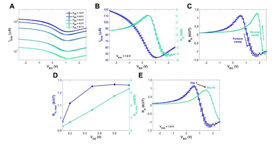 圖2. GHS性能和調(diào)優(yōu)特性。(A)偏置電壓變化時(shí),偏置電流與后門電壓的關(guān)系。(B)同時(shí)測量偏置電流(藍(lán)色)和霍爾電壓(綠色),以增加后門電壓。(C)增加(藍(lán)色)和減少(綠色)后門電壓時(shí)測量的霍爾系數(shù)RH。(D)變化偏置電壓下可達(dá)到的最大霍爾系數(shù)(藍(lán)色)和霍爾電壓(綠色)。(E)初始霍爾系數(shù)調(diào)諧曲線與環(huán)境條件下42天后測量的霍爾系數(shù)調(diào)諧曲線的比較。在室溫環(huán)境條件下,同一傳感器的所有測量值。誤差條表示兩次重復(fù)掃描的標(biāo)準(zhǔn)誤差。