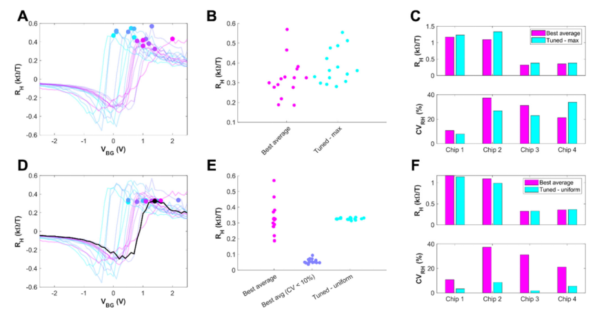 圖4. 最大化GHS響應(yīng)和補(bǔ)償變異性與后門調(diào)諧。(A)為同一芯片上的所有傳感器選擇工作點(diǎn)以使霍爾靈敏度最大化。(B)單個(gè)后門電壓(左)與單獨(dú)調(diào)諧每個(gè)器件以最大化靈敏度(右)的可實(shí)現(xiàn)霍爾靈敏度分布的比較。(C)調(diào)整器件以使靈敏度最大化后陣列范圍內(nèi)平均霍爾靈敏度和變異系數(shù)的變化。(D)為同一芯片上的所有傳感器選擇工作點(diǎn),以最大限度地提高均勻性。此條件下的限敏裝置用黑色表示。(E)單個(gè)后門電壓(左)與單獨(dú)調(diào)諧每個(gè)器件以最大化均勻性(右)的霍爾靈敏度分布的比較。(F)調(diào)整器件以使均勻性最大化后陣列范圍內(nèi)平均霍爾靈敏度和變異系數(shù)的變化。