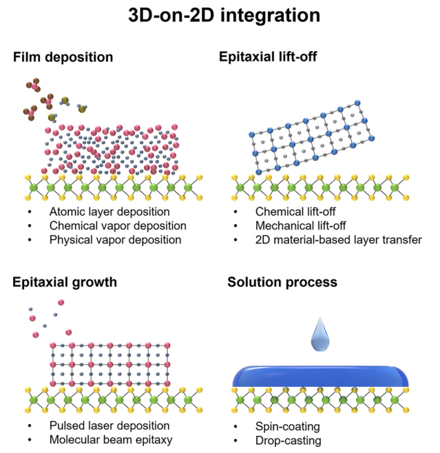 二維(2D)材料由于具有超高載流子遷移率、優(yōu)越的機(jī)械柔性和特殊的光學(xué)特性等下一代電子學(xué)所需的特殊性能而受到廣泛關(guān)注。盡管其潛力巨大,但實(shí)驗(yàn)室到晶圓廠過渡的主要技術(shù)難點(diǎn)之一在于二維材料與經(jīng)典材料系統(tǒng)(通常由三維(3D)材料組成)的無縫集成。由于二維表面的自鈍化性質(zhì),在二維材料上形成三維材料異質(zhì)結(jié)構(gòu)(3D-on-2D)時(shí),獲得定義良好的界面尤其具有挑戰(zhàn)性。在這里,本研究全面回顧了3D-on-2D摻入策略的最新進(jìn)展,包括直接生長(zhǎng)到基于層轉(zhuǎn)移的方法以及從非外延到外延的集成方法。技術(shù)進(jìn)步和障礙進(jìn)行了嚴(yán)格的討論,以探索最佳的,但可行的,整合策略的三維對(duì)二維異質(zhì)結(jié)構(gòu)。最后,展望了混合維集成過程,確定了最新技術(shù)中的關(guān)鍵挑戰(zhàn),并提出了未來創(chuàng)新的潛在機(jī)遇。