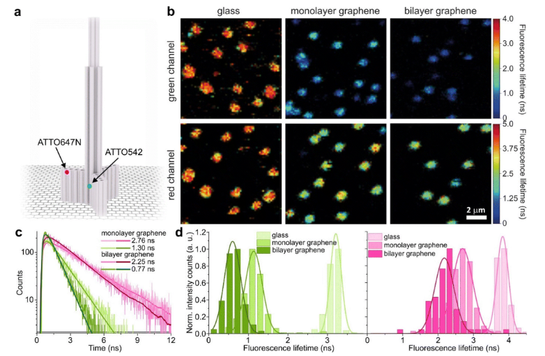圖1. (a) 固定在石墨烯上的柱狀DNA折紙納米結(jié)構(gòu)草圖,標(biāo)記了染料分子的位置,染料ATTO542(綠色)位于離基底表面16 nm的高度,染料ATTO647N(洋紅)位于離基底表面24 nm的高度。(b) DNA折紙納米結(jié)構(gòu)(如圖(a)所示)獲得的示例熒光壽命強(qiáng)度圖(10×10μm)標(biāo)記有兩個(gè)染料分子,綠色染料ATOT542(綠色通道,上面板)和固定在玻璃上的紅色染料ATOT647N(紅色通道,下面板)(左側(cè))、單層石墨烯(中間)和雙層石墨烯(右側(cè))。(c) 共定位的綠色(綠色)和紅色(品紅)染料分子的熒光衰變的例子,定位在DNA折紙納米結(jié)構(gòu)上,固定在單層(明暗)和雙層石墨烯(暗暗)上,具有單指數(shù)函數(shù)。(d) 玻璃、單層和雙層石墨烯固定的DNA折紙納米結(jié)構(gòu)中共定位染料分子ATOT542(綠色)和ATOT647N(洋紅)的熒光壽命直方圖符合高斯函數(shù)。