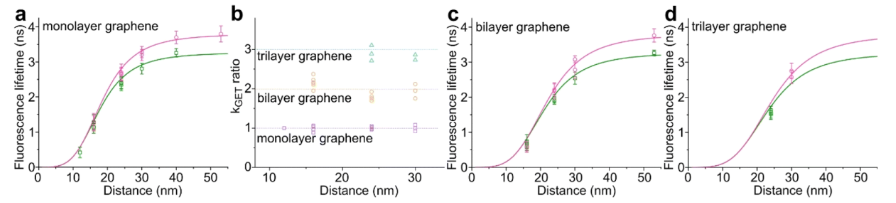 圖2. DNA折紙納米結(jié)構(gòu)中共定位染料分子熒光壽命測(cè)量的平均值和標(biāo)準(zhǔn)偏差。研究了ATOT542(綠色)和ATOT647N(品紅)與距離的函數(shù)關(guān)系:(a)單層,(c)雙層和(d)三層石墨烯。(b) 多層石墨烯與單層石墨烯的能量轉(zhuǎn)移率之比作為距離的函數(shù)。綠色(ATTO542)和品紅(ATTO647N)曲線(xiàn)(a、c和d),作為石墨烯和發(fā)射極之間距離d的函數(shù),其中d