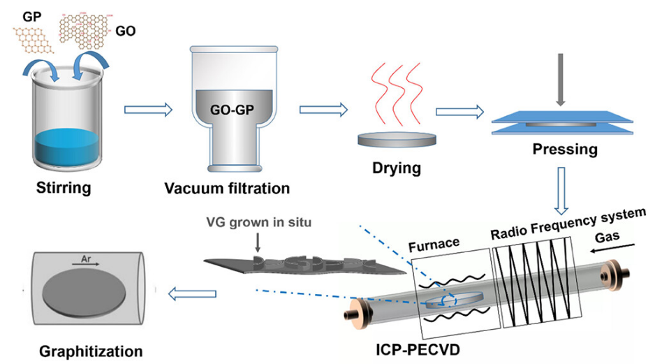 石墨烯薄膜成本高,但在電子領(lǐng)域有著廣泛的應(yīng)用。機(jī)械剝離是制備石墨烯(GP)的一種經(jīng)濟(jì)有效的方法,但兩者之間的弱互連會對薄膜性能產(chǎn)生負(fù)面影響。為了解決這個問題,添加少量氧化石墨烯(GO)的GP分散體被真空過濾、干燥并壓制成氧化石墨烯/石墨烯(GO/GP)膜。然后,采用電感耦合等離子體增強(qiáng)化學(xué)氣相沉積(ICP-PECVD)技術(shù)在GO/GP薄膜表面原位生長垂直石墨烯(VG),并進(jìn)行石墨化處理,制備RGO/GP/VG復(fù)合薄膜。結(jié)果表明,RGO/GP/VG復(fù)合薄膜的導(dǎo)熱系數(shù)為581.89 W m