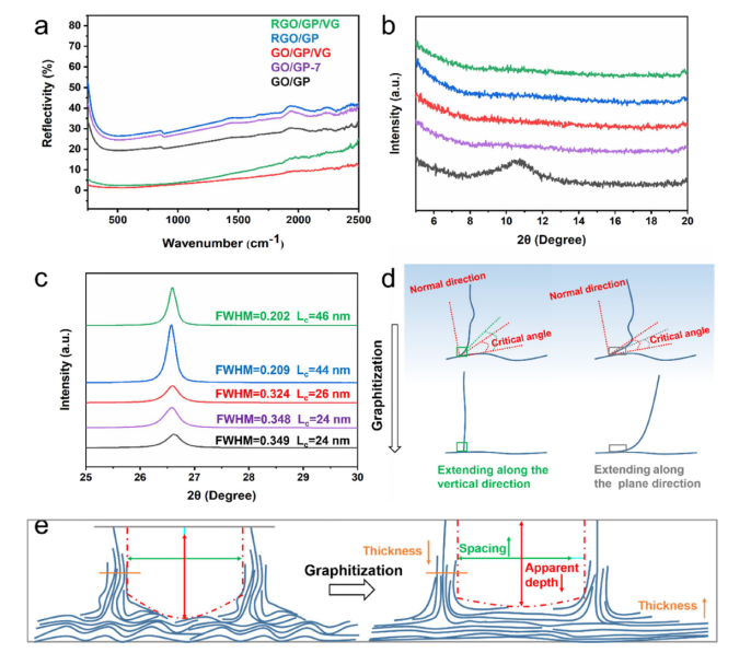 圖5. (a) 薄膜的漫反射光譜。(b,c)薄膜的XRD圖譜。(d,e)石墨化過程中VG的結(jié)構(gòu)演變。