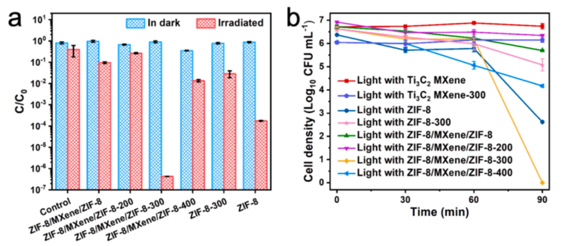 開發(fā)有效的水凈化系統(tǒng)對于控制和修復(fù)環(huán)境污染至關(guān)重要,尤其是在殺菌方面。在此,作者展示了精心設(shè)計(jì)的由二維(2D)Ti3C2 MXene 納米片核心和連續(xù) ZIF-8 超薄外層組成的三明治結(jié)構(gòu)復(fù)合納米片及其在光催化殺菌中的潛在應(yīng)用。研究結(jié)果表明,保形 ZIF-8-MXene 納米片擴(kuò)大了光吸收范圍(826 nm),提高了光熱轉(zhuǎn)換效率(6.2 ℃ s