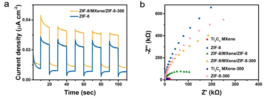 Fig 6. (a) ZIF-8 和 ZIF-8/MXene/ZIF-8-300 的瞬態(tài)光電流響應(yīng)。(b) 在 0.5 M Na2SO4(pH≈7)溶液中模擬陽光照射下測量的 EIS 光譜的奈奎斯特圖。