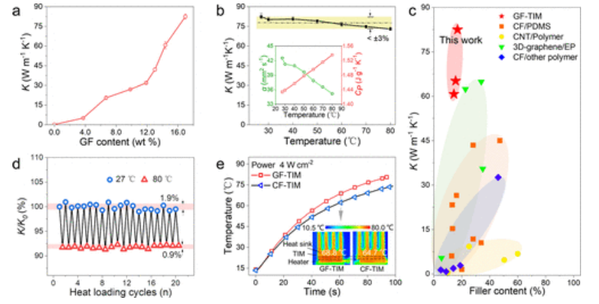 Fig 3. GF-TIM 的導熱性。(a) 不同 GF 含量下 GF-TIM 的導熱系數(shù)(K)。(b) GF-TIM 導熱系數(shù)(K)與溫度的關系。插圖顯示了 GFTIM 的熱擴散和比熱容與溫度的關系。(c) GF-TIM 的 K 值隨填料含量的變化與之前報道的含有不同導熱填料的 TIMs 的比較。(d) GF-TIM 在 27 至 80℃ 循環(huán)加熱負載下的 K 保持率。(e) TIM 的表面溫度隨時間的變化。插圖顯示了用于演示穿透平面?zhèn)鳠崮芰Φ臏y試配置。