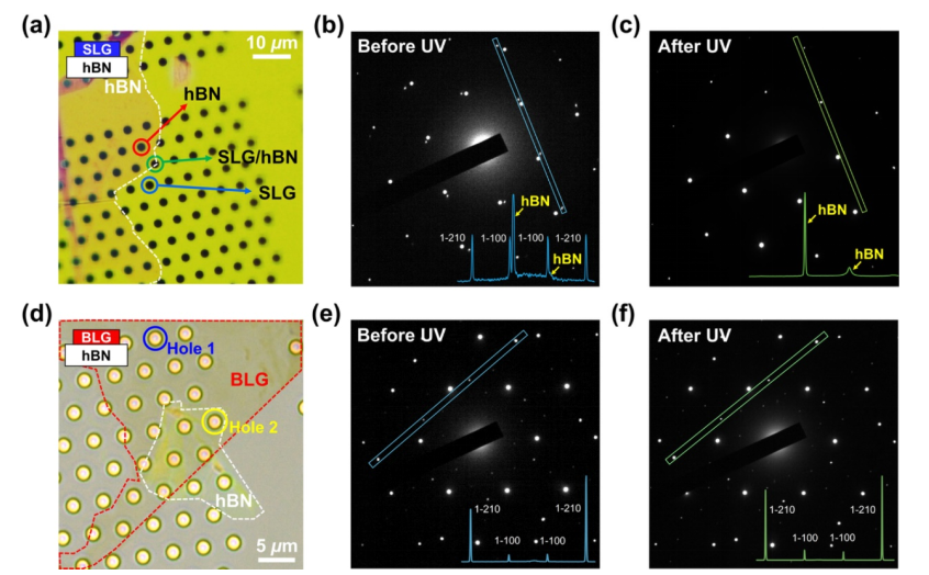 圖3. 準(zhǔn)分子紫外輻照240 s后hBN上石墨烯的TEM表征。(a) TEM樣品制備,包括SLG、hBN和TEM網(wǎng)格。插圖說明了TEM網(wǎng)格上石墨烯/hBN的結(jié)構(gòu)順序。(b,c)在(b)和(c)受激準(zhǔn)分子UV蝕刻之前在SLG/hBN獲得的沿著指定線的代表性SAED圖案和相應(yīng)的強(qiáng)度分布(插圖)。(d-f)與BLG/hBN的(a-c)數(shù)據(jù)集相同???和孔2分別表示僅BLG和BLG/hBN結(jié)構(gòu)。(e)和(f)中的代表性SAED圖案是在第2孔獲得的。