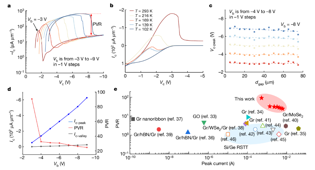 圖3. a、具有3微米間隙的晶體管的輸出特性Ic–Vc表示PVR。與溫度相關的輸出特性。c,對于Vb的不同偏置,具有從5微米到75微米增加的間隙長度dgap的器件顯示出降低的Vc峰值。d、峰值和谷值電流以及輸出特性中從90.6到24.6的相應PVR。e、與使用Si和Ge技術的Gr和RSTTs器件相比,我們器件的PVR基準。去吧,氧化石墨烯;六方氮化硼。