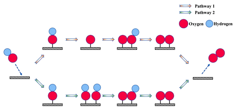 圖4. 堿性環(huán)境下不同的析氧反應(yīng)路徑。