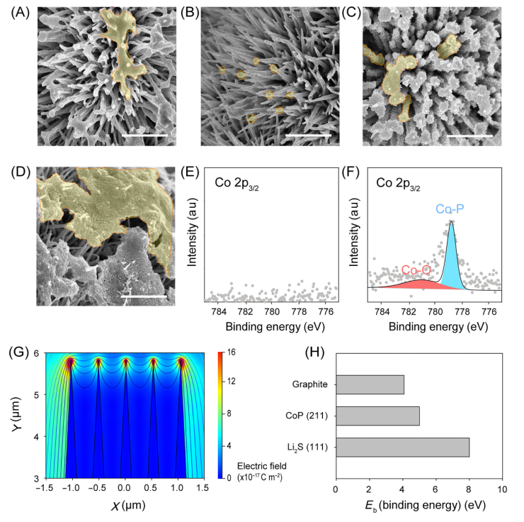 鋰硫電池的硫利用效率往往受到絕緣 Li2S 不受控制的電沉積和由此產(chǎn)生的電極鈍化的限制。通過誘導(dǎo)具有位置選擇性的形貌控制Li?S電沉積,成功緩解了硫正極的鈍化問題。研究者將CoP納米針電極與高配位數(shù)(含LiBr)的電解質(zhì)相結(jié)合,使Li?S在CoP針尖端選擇性成核并進(jìn)行三維(3D)生長,而針的下部在放電過程中保持未鈍化狀態(tài),從而實(shí)現(xiàn)了1400 mAh g?¹的高放電容量。通過對比評估未使用CoP納米針電極和/或LiTFSI電解質(zhì)的電池,研究結(jié)果表明,尖端效應(yīng)與高Li?S溶解度的結(jié)合有效延緩了電極鈍化。因此,該研究提供了一種控制Li?S沉積位點(diǎn)和沉積形貌的新方法,并提出了一種通過電極和電解質(zhì)設(shè)計(jì)協(xié)同作用來實(shí)現(xiàn)高性能鋰硫電池的新策略。此外,該研究中的選擇性沉積技術(shù),有望應(yīng)用于下一代電池,如鋰氧電池,這類電池同樣面臨電極鈍化的挑戰(zhàn)。