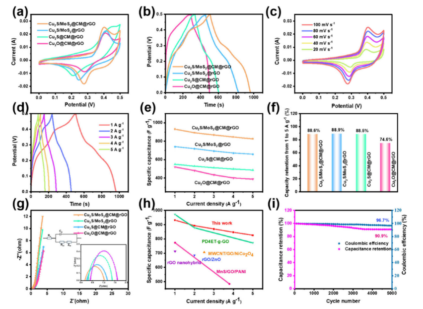 2@CM@rGO與其他rGO基材料的比電容的比較。(i) Cu