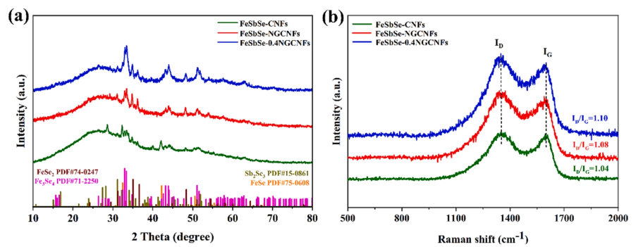 圖3. (a) FeSbSe-CNFs、FeSbSe-NGCNFs 和 FeSbSe-0.4NGCNFs 的 XRD 圖案和 (b) 拉曼光譜。
