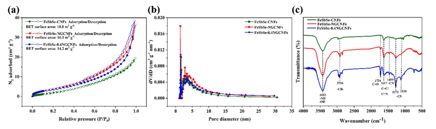 圖4. (a–b)FeSbSe-CNFs、FeSbSe-NGCNFs 和 FeSbSe-0.4NGCNFs 的 Brunauer–Emmett–Teller 曲線和相應的孔徑分布曲線;(c)FeSbSe-CNFs、FeSbSe-NGCNFs 和 FeSbSe-0.4NGCNFs 的 FTIR 光譜。
