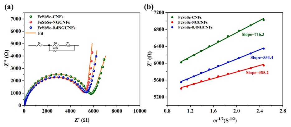 圖7. (a)FeSbSe-CNFs、FeSbSe-NGCNFs 和 FeSbSe-0.4NGCNFs 電極的 EIS 奈奎斯特圖和(b)Z′ 和 ω