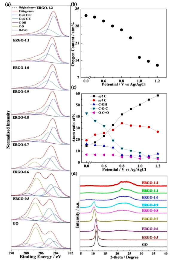 圖4. GO和ERGO的特性:(a)在不同電位下還原的ERGO薄膜的C 1s XPS曲線,(b)通過元素分析確定的氧含量,(c)ERGO薄膜中含氧基團(tuán)和非含氧基團(tuán)的濃度與還原電位的關(guān)系,(d)在不同電位下還原的ERGO的XRD光譜。